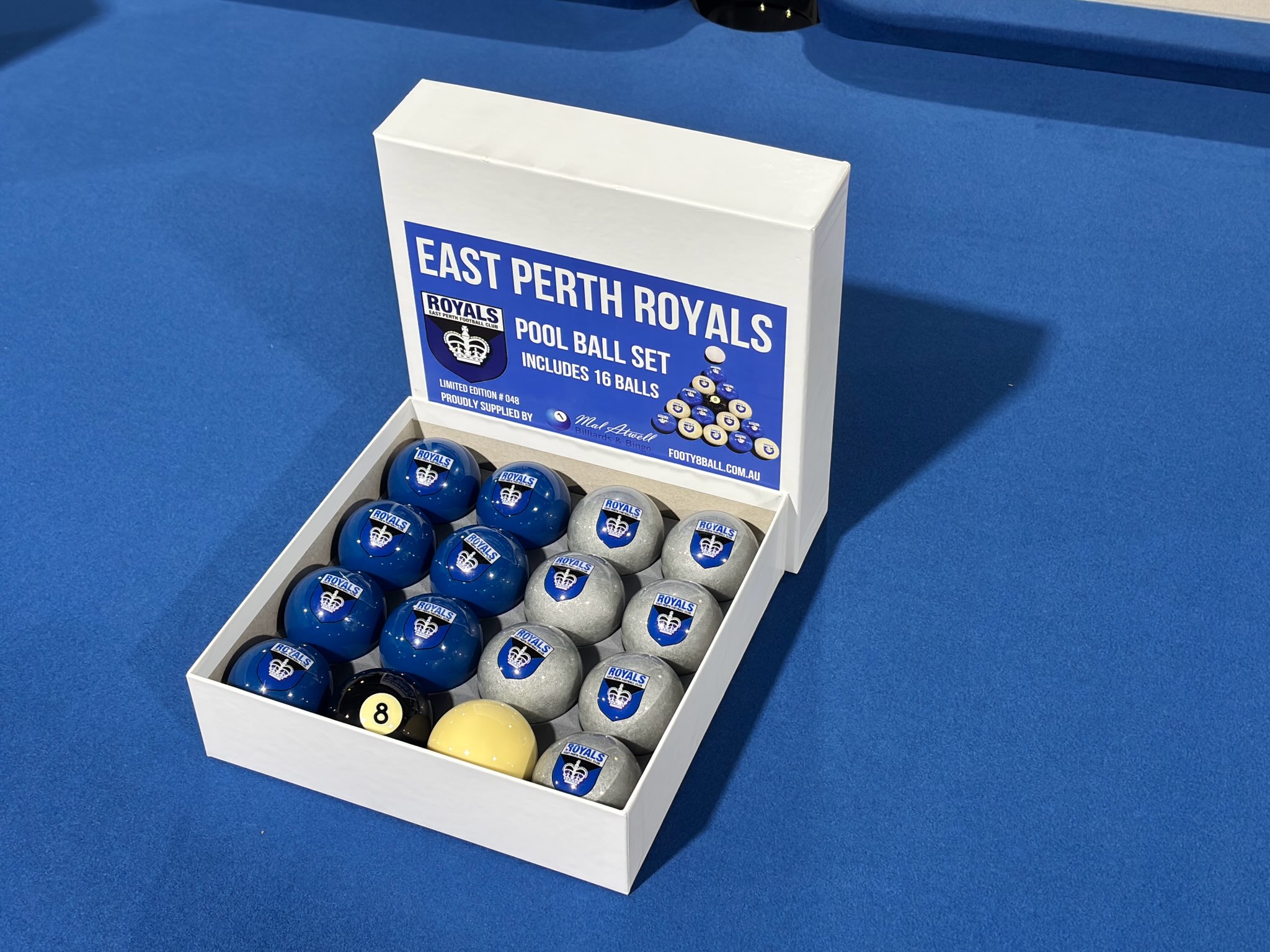 Bring the Royal spirit to your games room with this limited-edition East Perth Football Club Pool Ball Set. Crafted in Belgium for premium quality and durability, this 16-ball collection features custom EPFC blue and silver balls proudly stamped with the Royals emblem. Produced in partnership with Mal Atwell Bingo & Billiards in Perth, this set is the ultimate addition for fans, collectors, and anyone wanting to elevate their pool table with true East Perth pride. 59 sets available all individually numbered from 1 to 59 as Limited Edition.In store collection only from East Perth Football Club or purchase via malatwell.com.au for home delivery with all retail profit going to the MIGHTY Royals!