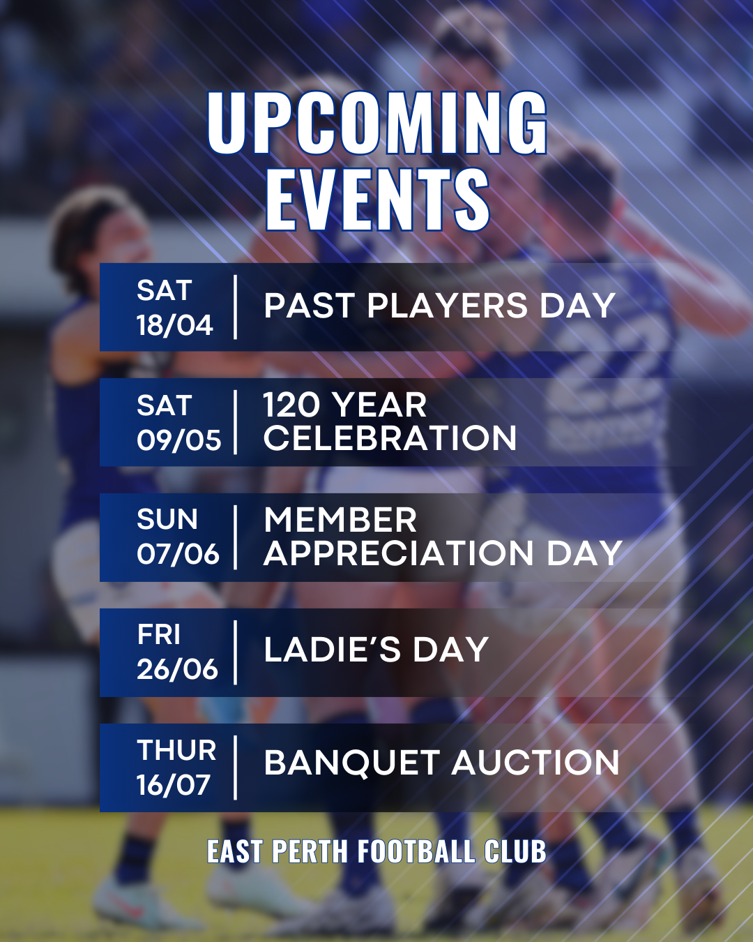 From celebrating our proud history at Past Players Day and our 120 Year Celebration, to recognising our loyal supporters on Member Appreciation Day, plus fan-favourite events like Ladies Day and the Banquet Auction, there’s something for everyone.